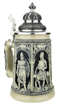 This beautiful 2 liter hand painted Limited Edition Collectible stein is a masterpiece of the steinmaker’s art and depicts famous Crusaders, specifically prominent leaders of the First Crusade (1096-1099 AD) dressed in full armor including Raimound IV of Toulouse, Baldwin (Balduin) I of Edessa, Boemund of Tarent & Godfrey of Bouillon. Each crusader is framed in an arch supported by columns.